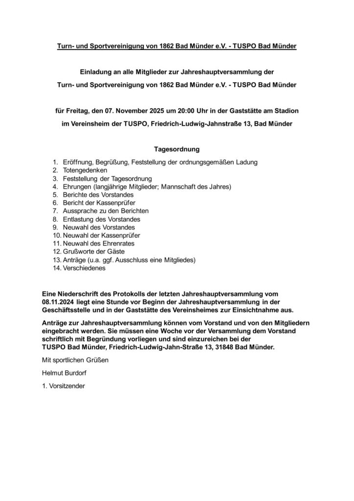 Einladung an alle Mitglieder zur Jahreshauptversammlung der Turn- und Sportvereinigung von 1862 Bad Münder e.V….